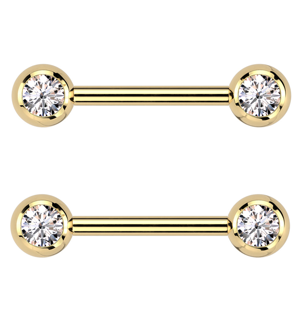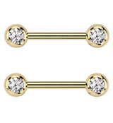 Elevate your look with our Gold PVD Clear CZ Ball Internally Threaded Titanium Nipple Barbells. Sold in pairs, these 14G barbells are available in lengths of 1/2" (12mm) with 5mm balls and 5/8" (16mm) with 6mm balls. Our gold pvd on ASTM F-136 Titanium Implant grade ensures both quality and safety, while the clear CZ gems add a touch of sparkle. Internally threaded for easy wear.