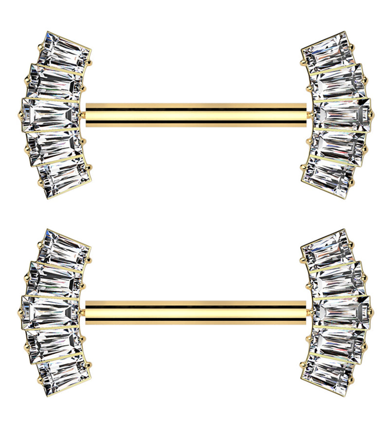 Golden, threadless titanium nipple barbells with five clear cz baguette-shaped gems on each end. The ends are about 11mm x 5mm in size. The size is 14G. Made with gold pvd on ASTM F-136 titanium. The wearable area is 9/16" (14mm) length. Sold in pairs (2pcs).