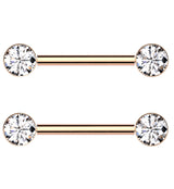 Rose gold, threadless titanium nipple barbells with double, bezel-set, clear cz gem ends that are about 5mm in size and have a rounded, convex back. Made with rose gold pvd on ASTM F-136 Implant grade titanium and available in size 14G (1.6mm) with a 9/16" (14mm) length. Sold in pairs (2pcs). For healed piercings.
