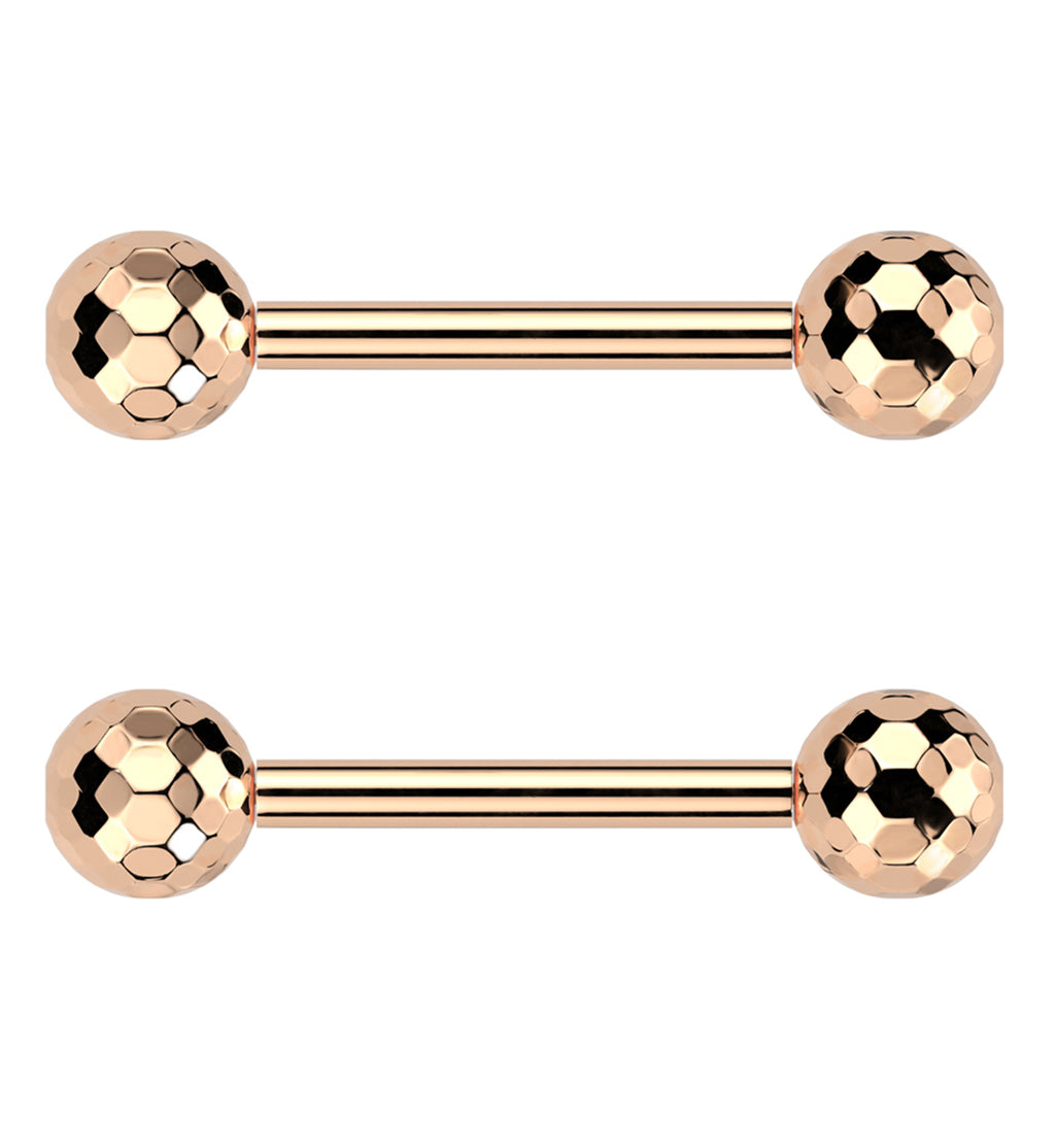 Beautiful, threadless titanium nipple barbells with multi-faceted, threadless ball on each end. Made with rose gold pvd on ASTM F-136 Implant grade titanium and available in size 14G (1.6mm). Choose your length size between 1/2" (12mm) and 5/8" (16mm). 1/2" (12mm) has 5mm balls and 5/8" (16mm) has 6mm balls. Available in pairs (2 barbells).