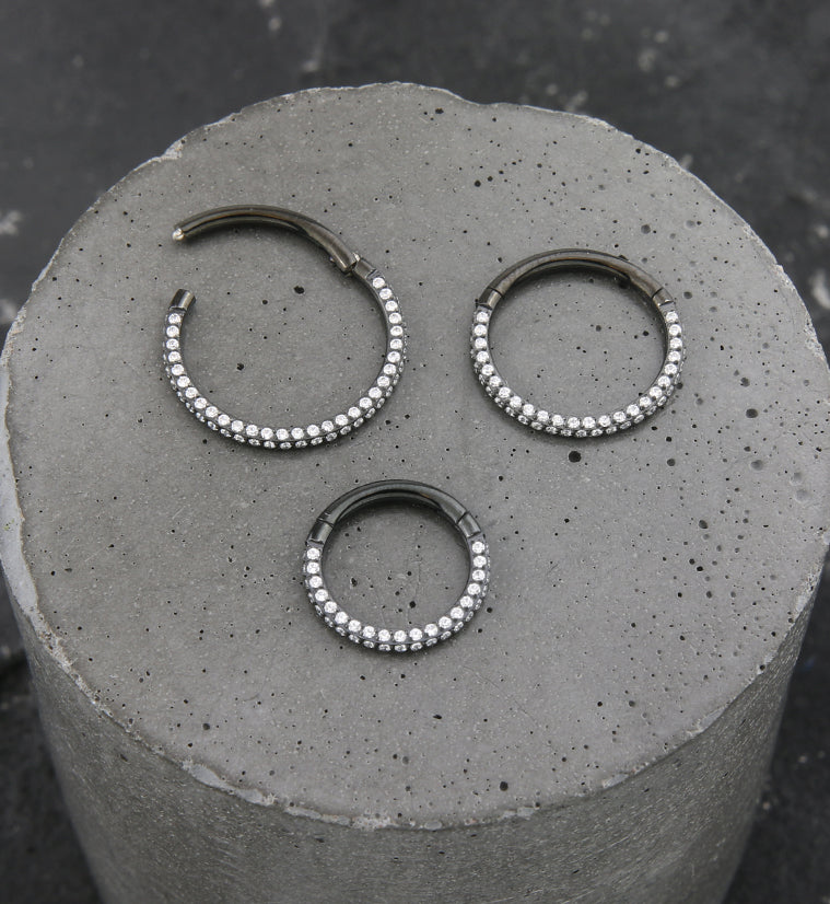 Hinged segment ring made from black pvd on ASTM F-136 titanium with a triple sided design that is full of clear cz gems on each side. Size is 16G. Choose your inner diameter size: 5/16" (8mm), 3/8" (10mm), 1/2" (12mm). The hinged design makes this piece easy to insert and remove. Sold individually (1pc).