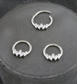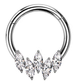 Hinged segment ring made from 316L stainless steel with a front-facing row of marquise-shaped clear cz gems. Size: 16G. Choose your inner diameter size: 5/16" (8mm), 3/8" (10mm). The hinged design makes this piece easy to insert and remove. Sold individually (1pc).