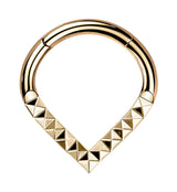 Blush colored hinged segment ring made from rose gold pvd on ASTM F-136 titanium with a front-facing polyhedra design. Size is 16G. Inner diameter size: 5/16" (8mm). Total height: 11mm. The hinged design makes this piece easy to insert and remove. Sold individually (1pc). For healed piercings.