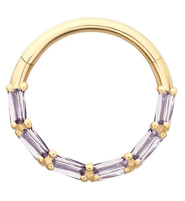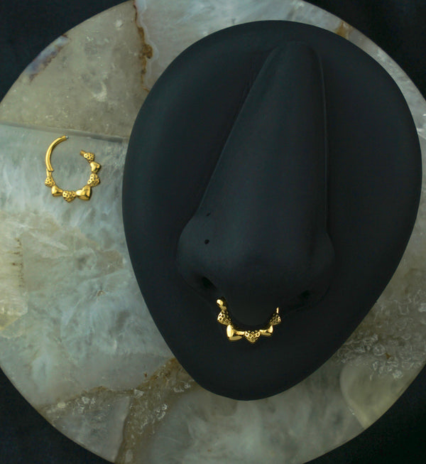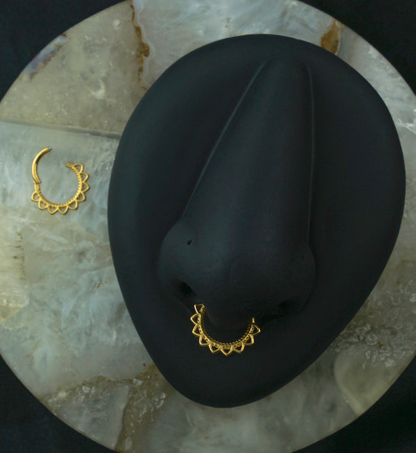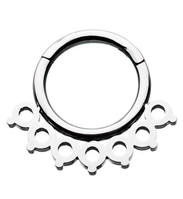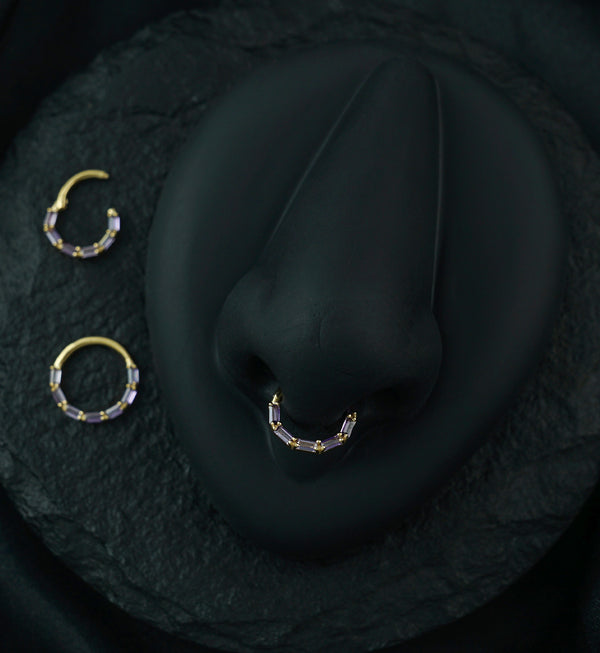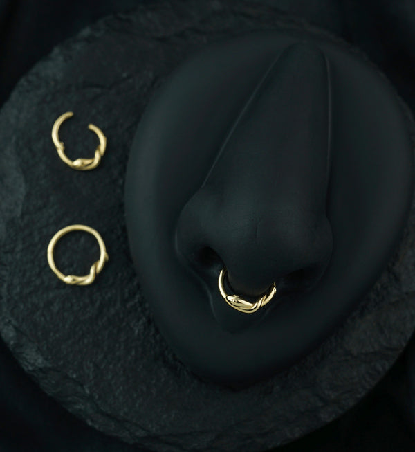 Hinged rings, often also called clickers or clicker rings, are rings or hoops that close by a hinge instead of by a removable segment or a captive bead. Hinged rings are often easier to open and close than captive bead rings or segment rings because the pieces stay attached. The hinge also provides security in the closure because there is an audible click or snap when the hinge is locked into place, which is where the name “clicker” comes from. There is typically a small seam visible in the ring from the hinge, which shows where to apply pressure for opening and closing. Our collection of titanium, stainless steel and gold hinged rings come 14G, 16G, and 18G gauges with 5/16" (8 mm) and 3/8" (10 mm) diameters. There are also larger-gauge options in some styles going all the way up to 0G and 00G gauge.