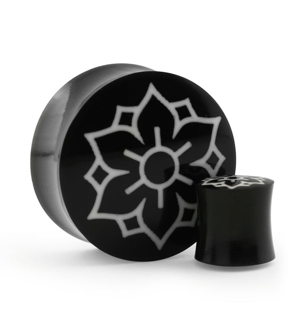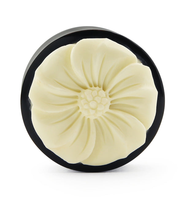 Horn Plugs With Carved Gardenia Flower Bone InlayHorn Plugs With Carved Gardenia Flower Bone Inlay
