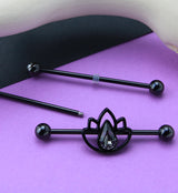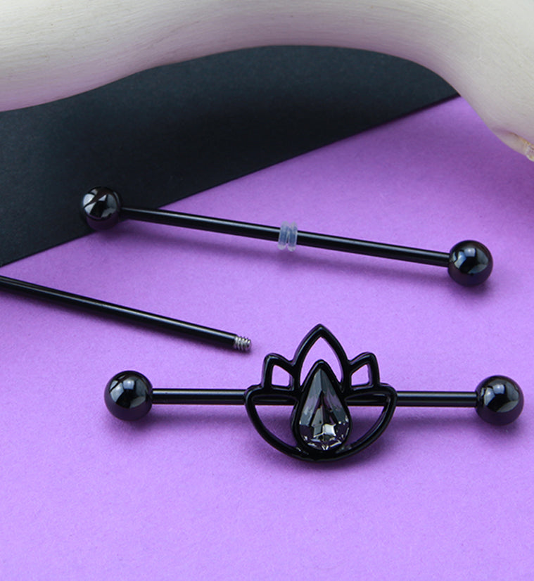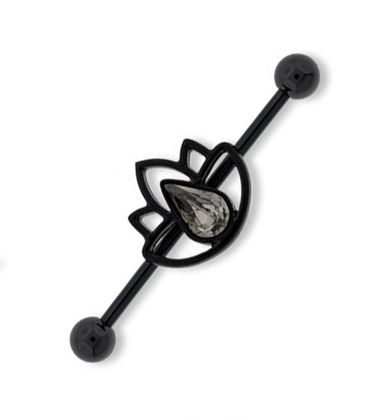 Embrace your inner darkness with our black lotus industrial barbell! The 14g straight barbell features 316L stainless steel construction with black PVD coating, external threading and 5mm ends. Sculpted lotus pendant features a grey Swarovski cubic zirconia gem for shadowy shimmer. Three barbell sizes are included (1 ¼”, 1 3/8”, 1 ½”) so you can find your best fit! Intended for healed piercings only.