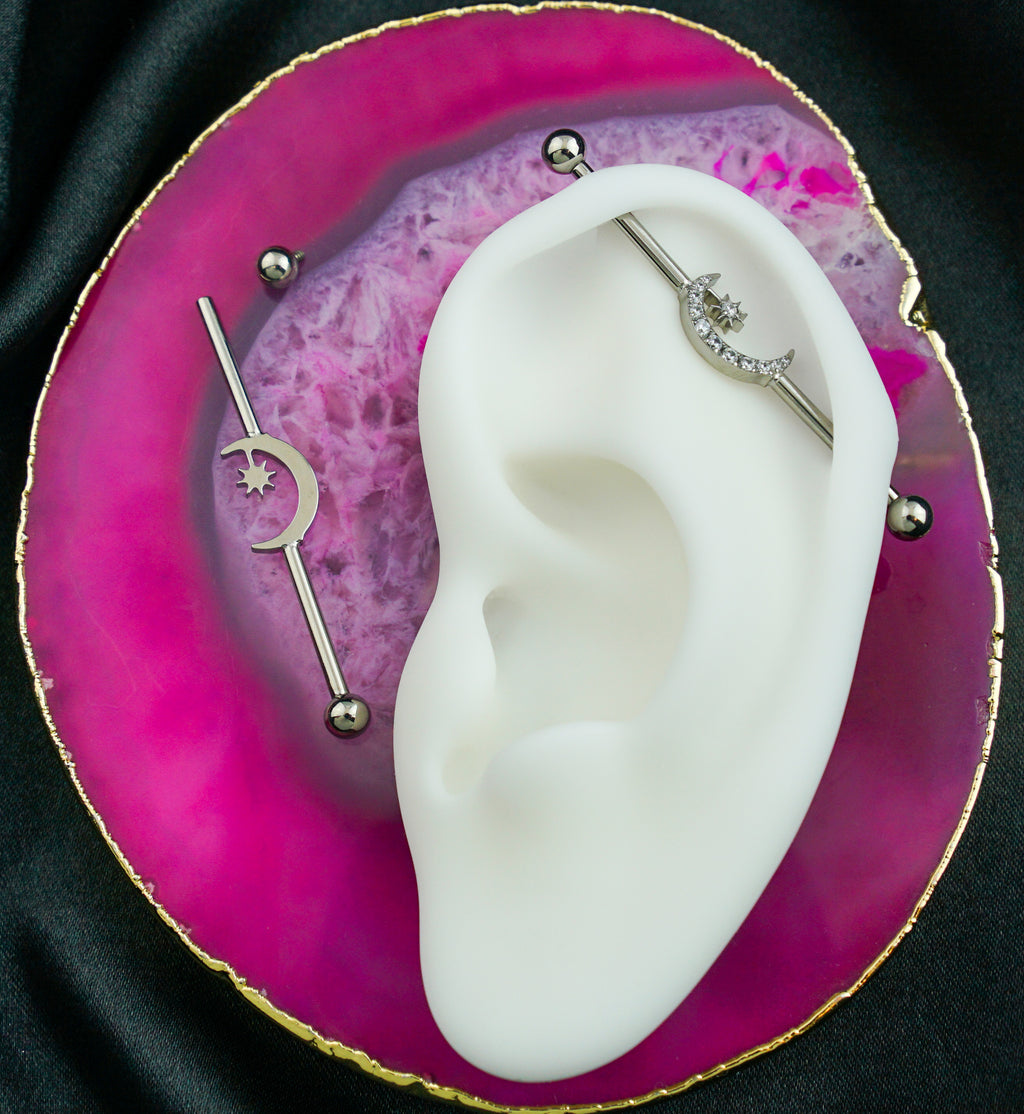 Twilight Moon And Star Clear CZ Internally Threaded Titanium Industrial Barbell