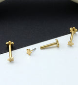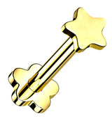 Threadless labrets with a star design on top and a flower shaped back. Size is 16G. Flower back is 4mm and top measures at 4mm. Made from gold pvd on ASTM F-136 titanium. Length is 5/16" (8mm). Sold individually (1 pc).