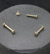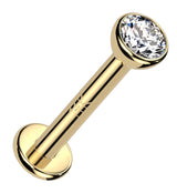 Internally threaded labret with a bezel set clear cz gem and flat back. Made from 14kt gold. Disk size is 3mm. Size is 16G. Choose your length between 1/4" (6mm) or 5/16" (8mm). Gem size is 3mm. Sold individually (2 pieces - top and bottom).