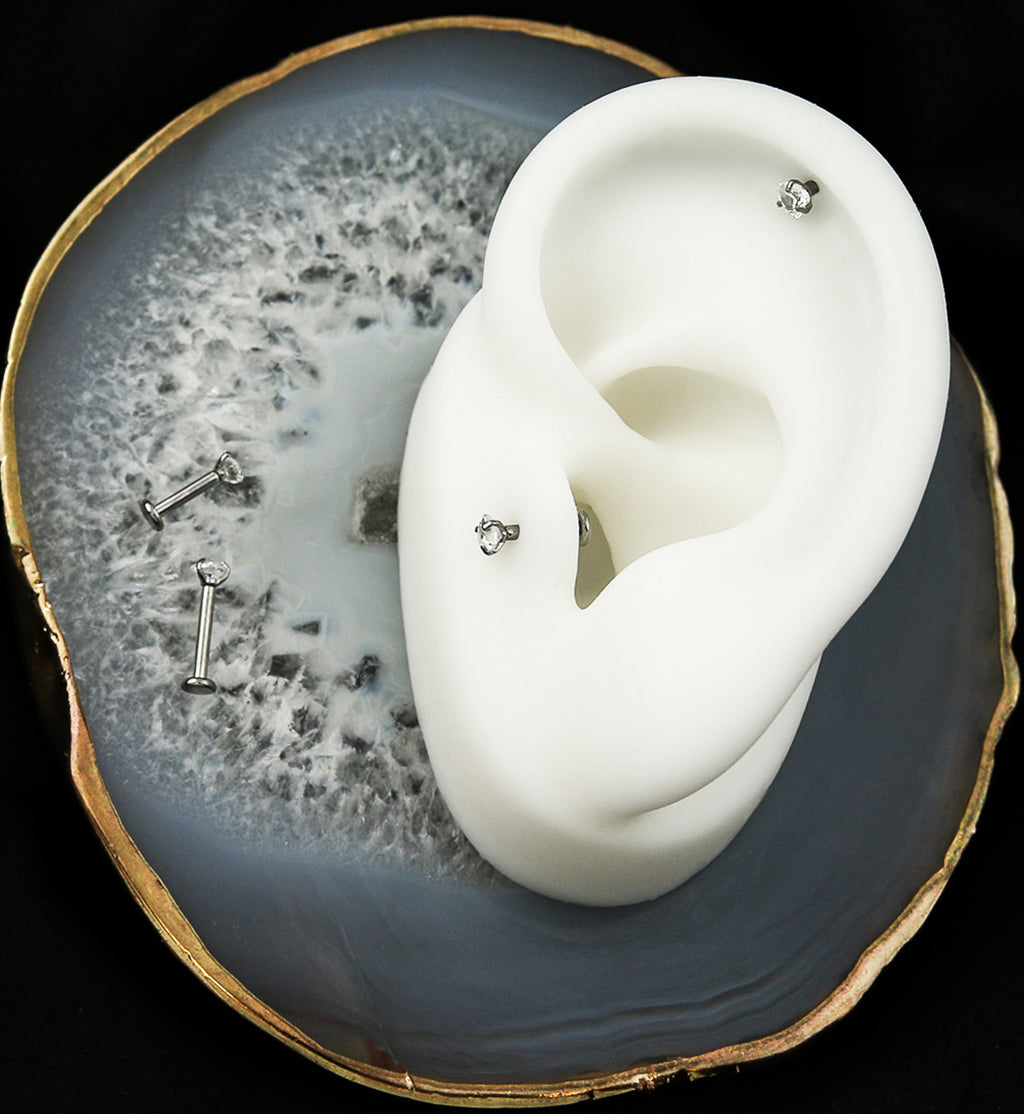 This 16G internally threaded labret has a disc size of 3mm. It also features a 3mm clear heart shaped cz gem. You can pick from two different wearable lengths: 1/4" (6mm) or 5/16" (8mm). It is made from durable ASTM F-136 titanium. Sold Individually (1 pc). Intended for healed piercings.