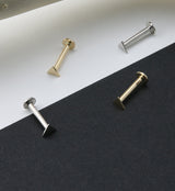 Fun labret with triangle top. Made from 14kt gold. Inner length is 8mm (5/16"). Disk size is 3mm. Choose your size: 18G or 16G. Threadless design. Sold individually (2 pieces - top and bottom). For healed piercings.