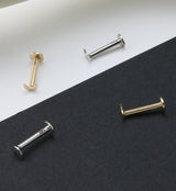 Classic labret with half moon crescent top. Made from 14kt white gold. Inner length is 8mm (5/16"). Disk size is 3mm. Choose your size: 18G or 16G. Threadless design. Sold individually (2 pieces - top and bottom). For healed piercings.