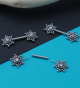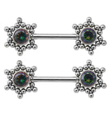 Gorgeous threadless nipple ring barbells made from 316L stainless steel. On each end there is a flower design filled with black aurora cz gems. The threadless design makes for easy insertion and removal. Size is 14G with an inner barbell length of 9/16" (14mm). Sold in pairs (2pcs). For healed piercings.