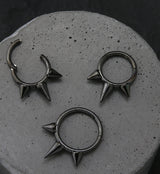 Black spiked hinged segment rings made from black pvd on 316L stainless steel. Hinged design makes for easy opening and closing. Size is 16G. Pick your diameter size from 5/16" (8mm) and 3/8" (10mm). Great for septum and cartilage piercings! Sold individually (1pc).