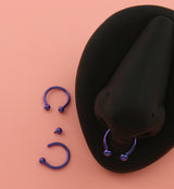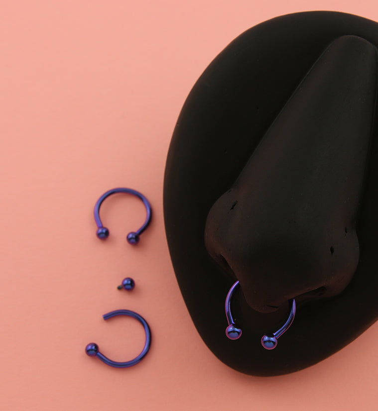 Stay on trend with our Blurple Titanium Circular Barbells. Crafted from ASTM F-136 implant grade Titanium, with an anodized blue/purple finish. Available in 16G & 14G, and inner diameters of 1/4”-9/16”. Choose 3mm or 4mm ball size. Perfect for cartilage, daith, or septum piercings. Sold individually.