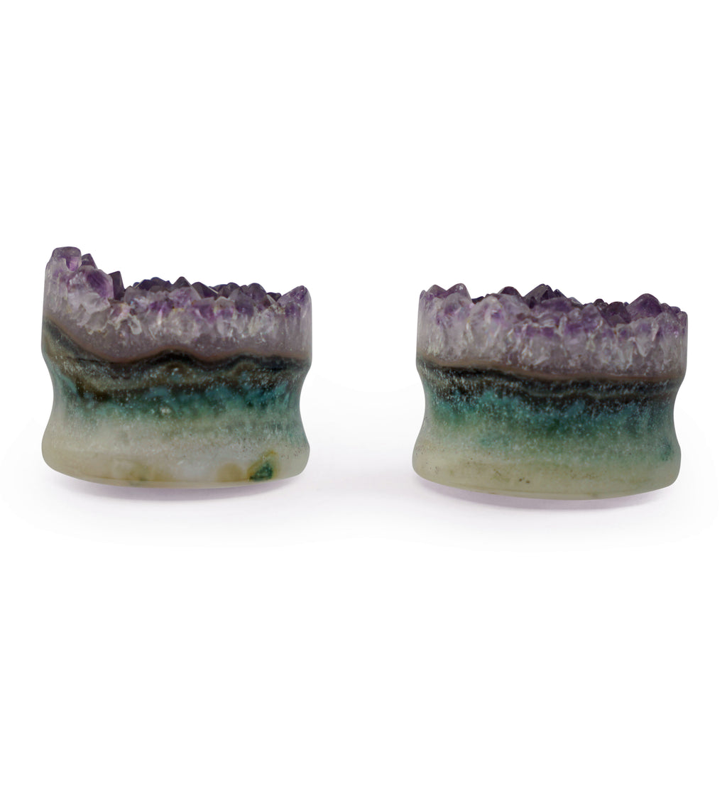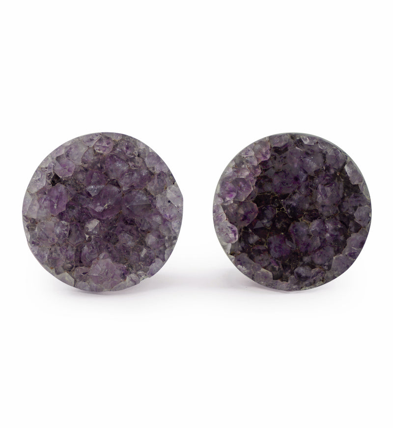Handmade Raw Amethyst Plugs that are a beautiful choice for those with stretched ears. Each plug is unique, as they are made from raw amethyst stones. These 1 inch (25mm) double flare plugs have a wearable area of 10mm and a full length of 19mm on one plug and 22mm on the other. Please handle with care, as they are fragile.