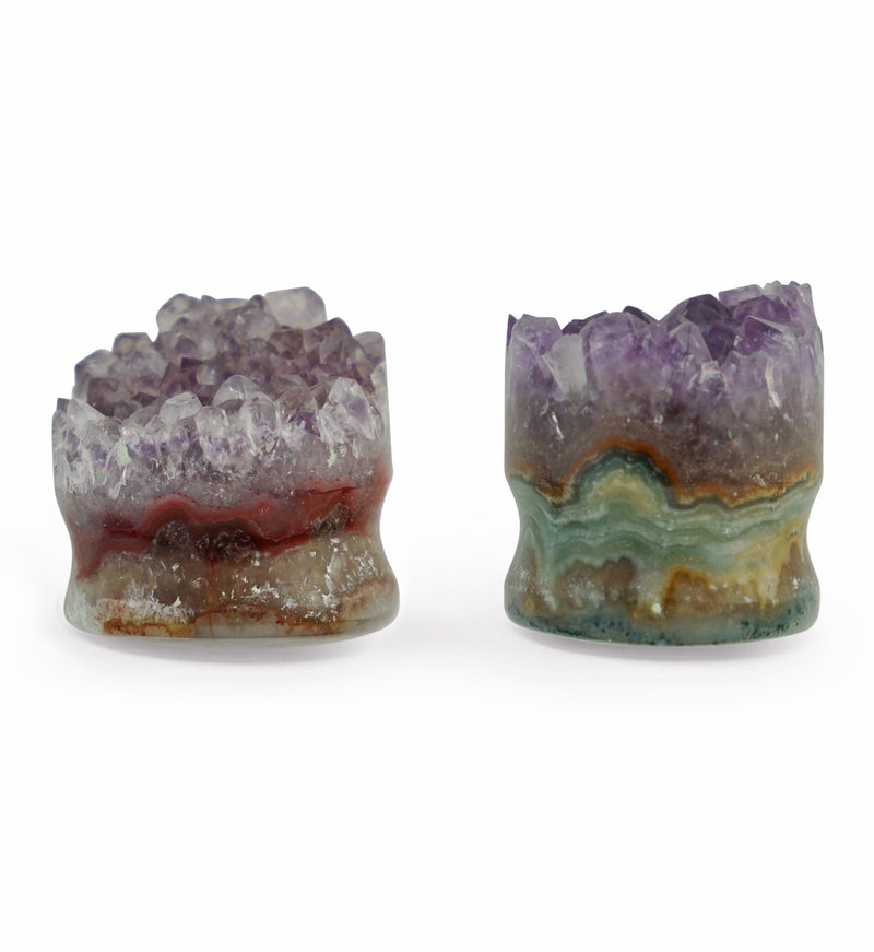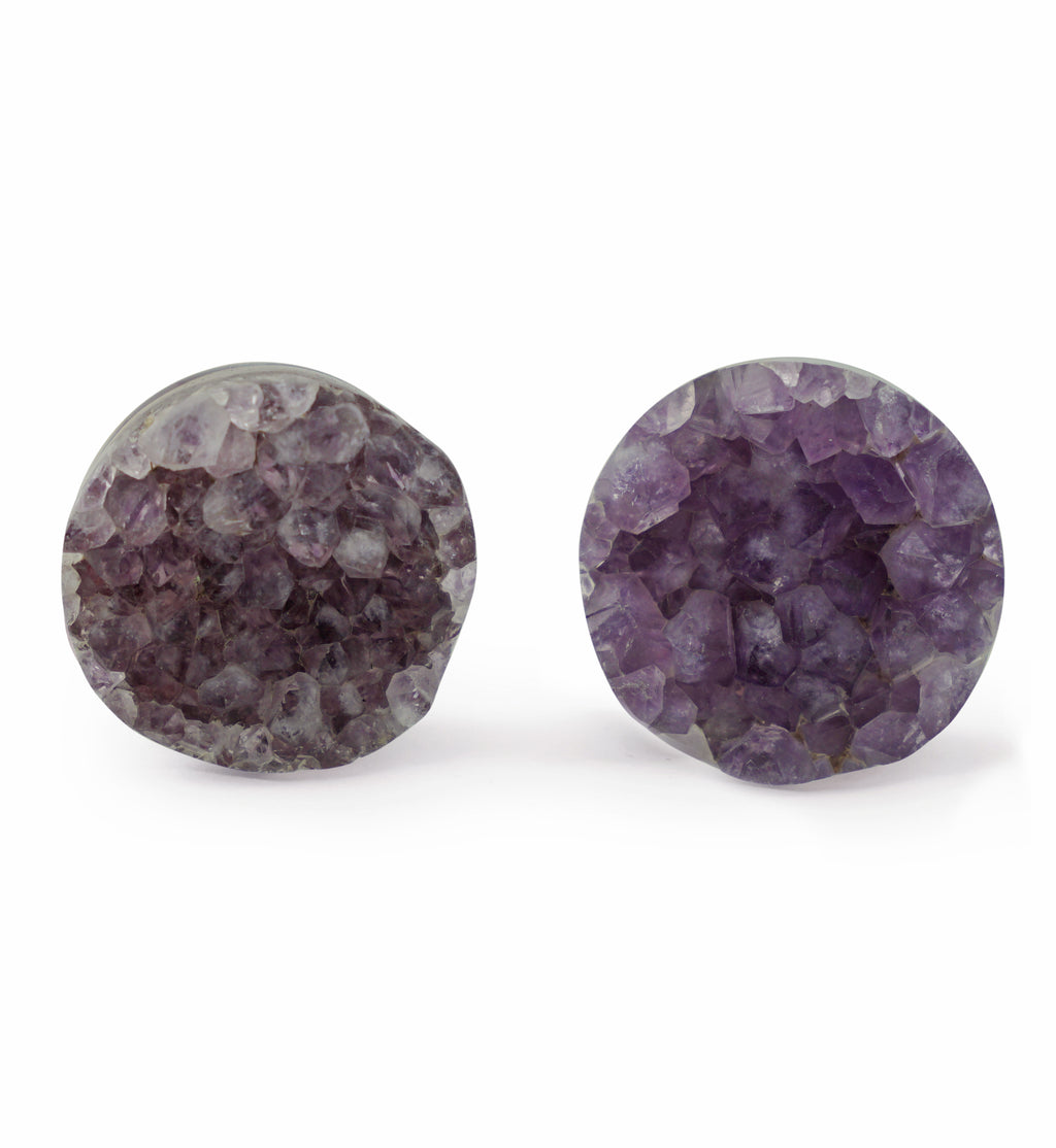 One of a kind raw amethyst stone double flare plugs that are handmade. The pair that is pictured is the pair that you will receive. Size is 7/8" (22mm) - please allow +/- 1-2mm due to the handmade style and natural cut of the stone. Full length is approximately 24mm for one plug and 26mm for the other. These have approximate lengths as the cut of the raw amethyst is different on every plug. Please note that some of the amethyst may extend out pretty far, so make sure your lobe is thick enough to handle the weight of the front. (Make sure to look at all photos before purchasing) Sold in pairs. Handle with care as these might break if dropped!