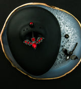 Externally threaded, bat-shaped belly button ring made from 316L stainless steel with black pvd and red cz gems. On the bottom is a bat design with wings outspread, filled with red cz gems. On top there is a single, 5mm red cz gem. The bottom design measures at 12mm x 22mm. Size is 14G with a 3/8" (10mm) length. Sold individually (1pc). For healed piercings.