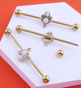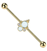 Golden, industrial barbells with a double white opalite design that is bezel set and accented with clear cz gems and beads. Made from gold pvd on 316L stainless steel. Design is about 12mm x 8mm. Size is 14G with a barbell length of 1-1/2" (38mm) and 5mm ball ends. Externally threaded and intended for healed piercings. Sold individually.