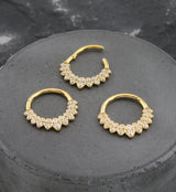 Hinged segment ring made from gold pvd on 316L stainless steel with a hoop design, decorated with clear round cz gems on either side, forming a long marquise shape. These gems gradually increase in size towards the center. Size is 16G. Choose your inner diameter size: 5/16" (8mm), 3/8" (10mm). The hinged design makes this piece easy to insert and remove. Sold individually (1pc).