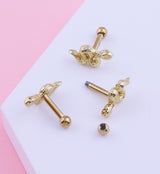 Tragus/cartilage barbell with a slithering, snake design. Made from gold pvd on 316L stainless steel. Externally threaded. Edgy piece for cartilage or tragus piercings! Size is 16G with a bar length of 1/4" (6mm) with a 2.5mm externally threaded ball end. Top size is 10mm x 5mm. Sold individually (1pc - top and bottom). For healed piercings.