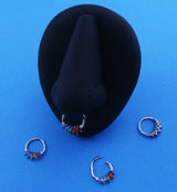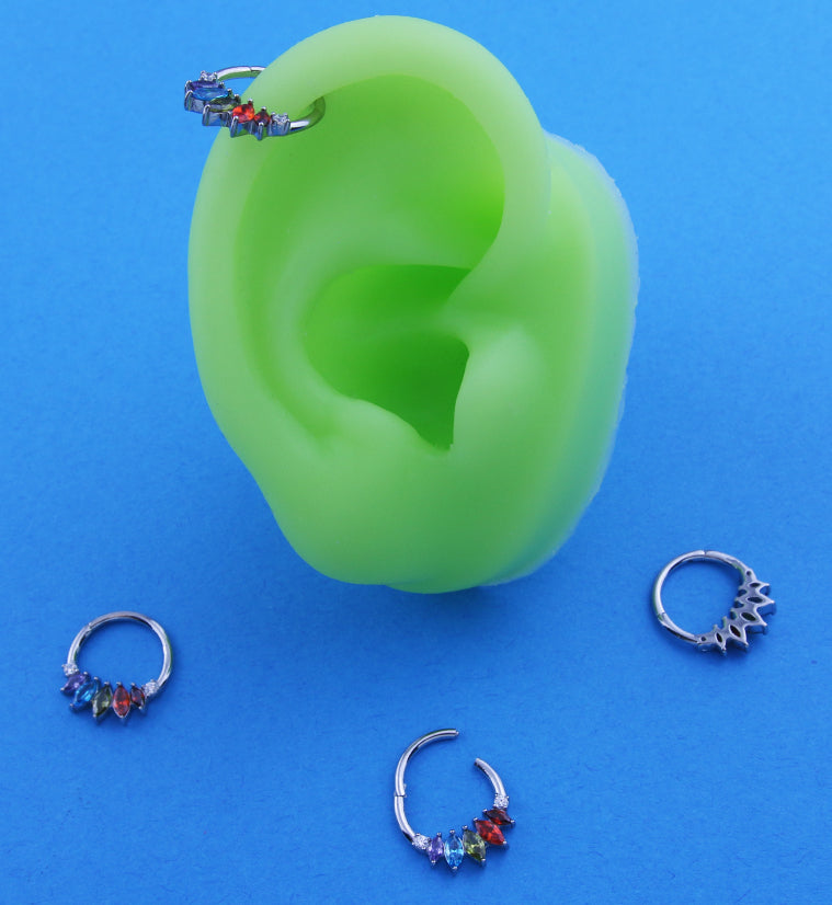 Colorful hinged segment ring made from strong 316L stainless steel with a hoop shape and a row of marquise rainbow cz gems along the bottom. Gem colors include: clear, amethyst, aqua, lime green, orange, red. Size is 16G with an inner diameter size of 3/8" (10mm). The hinged design makes this piece easy to insert and take out. Sold individually (1pc).
