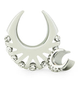 Stainless steel saddles with a fanned out design that is accented with clear cz gems. Made from 316L stainless steel. Available in sizes 0G (8mm) - 1" (25mm). Wearable area is about 6mm with a full length of 10mm. Wear them on their own or wear them with ear weights to evenly distribute weight. Sold in pairs (2pcs).