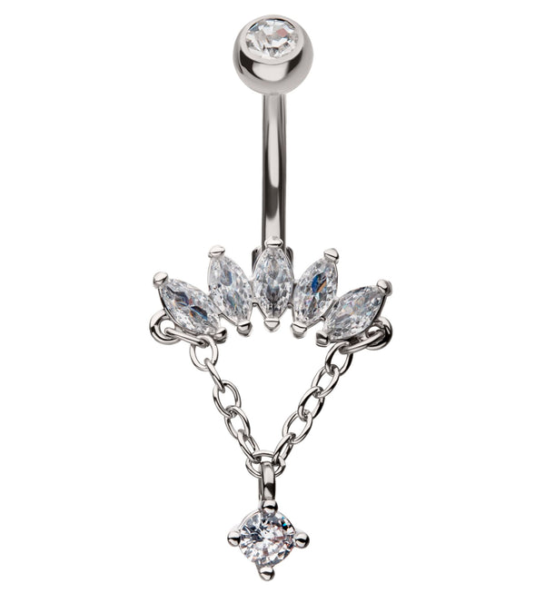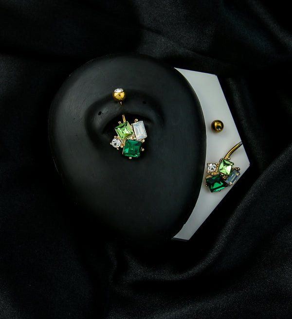 Gold PVD Teardrop Rainbow Aurora CZ Triple Bezel Dangle Stainless Steel Belly Button RingGold PVD Teardrop Rainbow Aurora CZ Triple Bezel Dangle Stainless Steel Belly Button Ring
