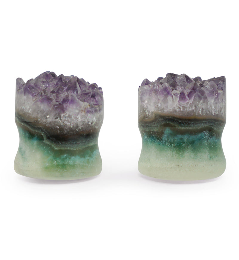 Sold in pairs, these Raw Amethyst Plugs are a great choice for those who have stretched ears and love handmade, stone plugs. Each plug is 100% unique, as they are made from raw amethyst stones. These 5/8" (16mm) double flare plugs have a wearable area of 8mm and a full length of 18mm-20mm. Make sure to look at all photos before buying and make sure your lobes can handle the weight of the front amethyst length. Please handle with care, as they are fragile.