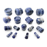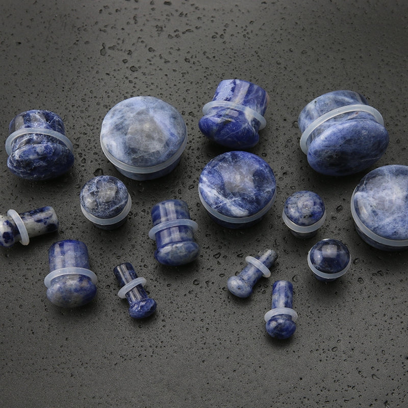 Sold in pairs (2 pieces) Single flares Clear "O" rings Smooth & polished Sodalite stone Pick from 8G - 5/8" Total length 13.5mm Wearable: 8mm. Can be adjusted with "O" ring Sizes can vary + / - by 1mm