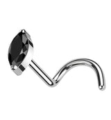Titanium nose screw rings with a single marquise, black cz gem on top. Top size is about 5mm. Choose your gauge size: 20G, 18G. Length is 1/4" (6mm). Made out of durable ASTM F-136 titanium. Sold individually (1 pc).