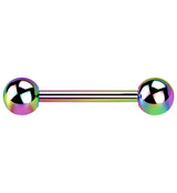 Titanium barbell made from rainbow pvd on ASTM F-136 titanium. Can be used for industrial, nipple and cartilage piercings. Size is 14G except for 5/16" (8mm) which is 16G. Choose your inner length size: 5/16" (8mm), 1/2" (12mm), 9/16" (14mm), 5/8" (16mm), 1 & 1/2" (38mm). Ball size is 5mm for all except 5/16" (8mm) size, which is 3mm. Externally threaded. Sold individually (1 pc). For healed piercings.