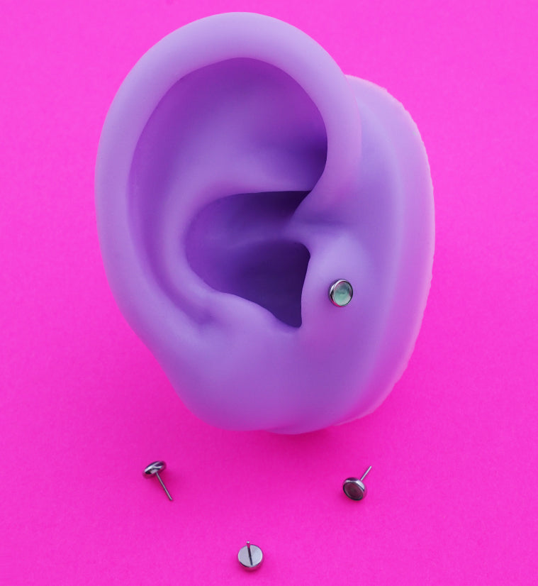 Threadless top piece that has a green onyx stone in round, bezel set. Fits all threadless posts. Made from ASTM F-136 titanium with a 316L stainless steel pin. Length is approximately 5mm. Top size: 4mm. Sold individually (1pc, top only).