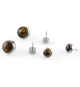 Sold individually (1 piece) Sizes: 3mm, 4mm, 5mm, 6mm Tiger eye stone ASTM F136 Ti-6AL-4V-ELI Titanium Threadless Designed to fit the barbells/labrets below Threadless Barbell Threadless Labret