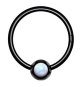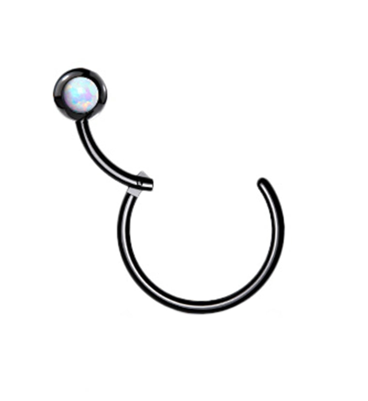 Introducing the Black PVD Opalite Hinged Segment Hoop Ring, made with black pvd on 316L stainless steel and featuring a shining synthetic white opal gem. Its hinged segment allows for easy opening and closing, making it perfect for septum, cartilage, or nipple piercings. Available in 18G and 16G sizes, with inner diameters of 5/16" (8mm) and 3/8" (10mm). Sold individually.