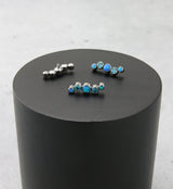 Striking internally threaded top piece that has an oscillating blue opalite and topaz cz design. Made from ASTM F-136 titanium and five bezel set cz gems and synthetic opal gems. Measures about 11.5mm x 3.3mm. M0.9 threading. Fits 16G internally threaded posts. Sold individually (top piece only).