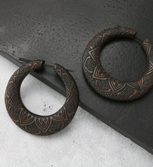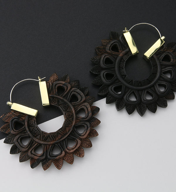 Carved Floral Black Onyx Inlay Sawo Wood Earrings