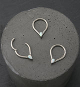 Hinged segment ring made from ASTM F-136 titanium with a v-shaped, pointed design accented with a 3mm, prong-set, teardrop, synthetic white opal gem. Size is 16G. Inner diameter size is 5/16" (8mm). The hinged design makes this piece easy to insert and remove. Sold individually (1pc).