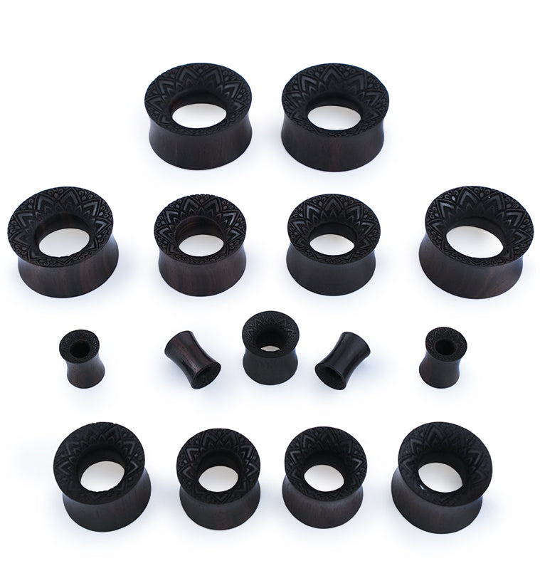 These Etched Mandala Areng Wood Plugs are expertly crafted with natural areng wood and feature a mandala etched design on the face of the plug. They have a double flare design for a secure fit. The plugs come in pairs and can be purchased in sizes from 2G (6mm) to 1&1/2" (38mm), with full lengths ranging from 10mm to 13mm and a wearable area of 9mm to 12mm.
