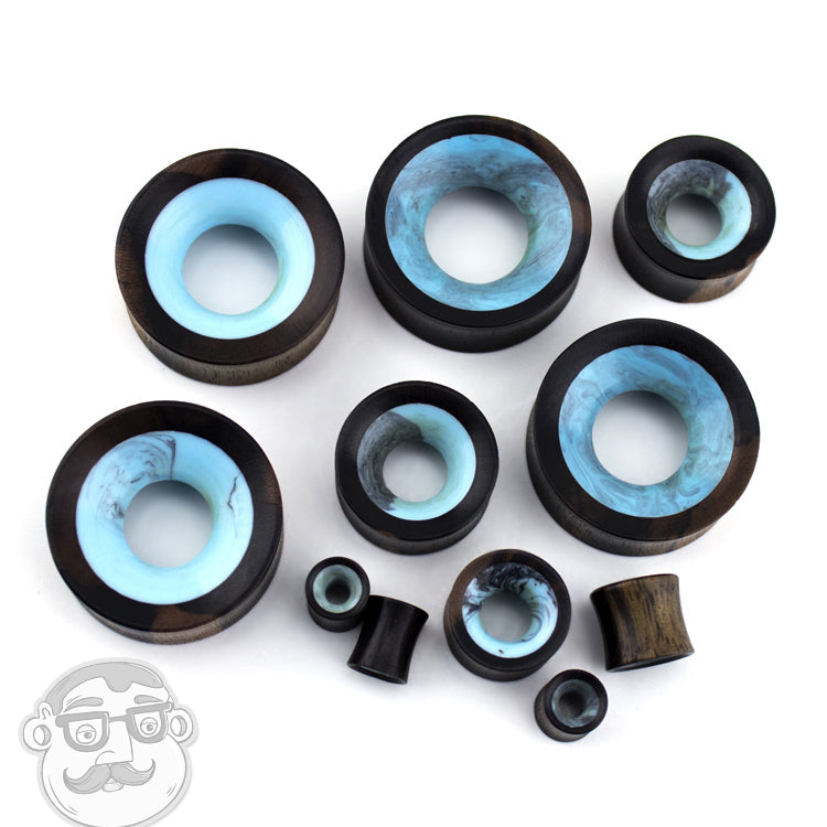 Cool areng wood tunnels with a concave design and filled with a sky blue/white resin inlay. Polished and smooth. Handmade. Available in sizes 2G (6mm) - 1 1/2" (38mm). These have double flares with an 11mm wearable area. Do not leave in direct sunlight or in water. Sold in pairs (2pcs).