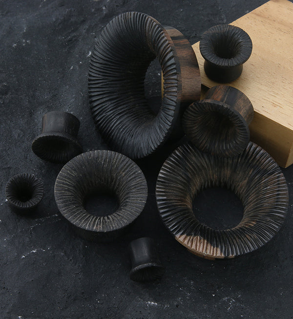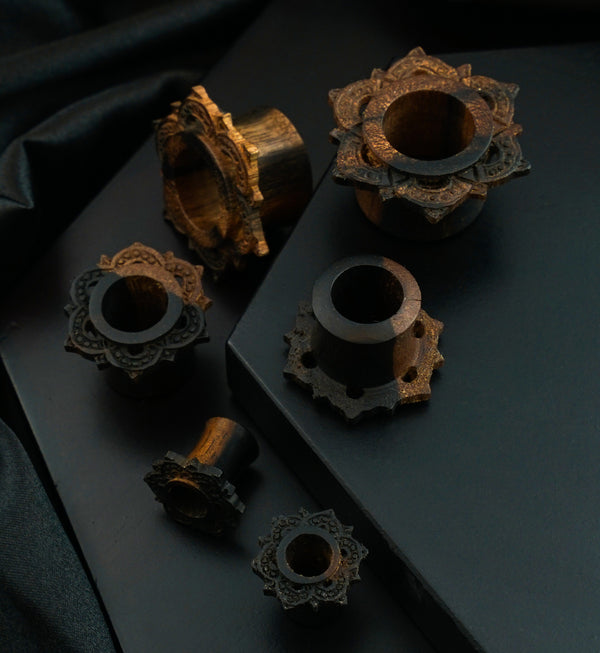 Our collection of high-quality wood plugs and tunnels offer you a ton of variety and color. We stock wooden plugs in 8 gauge up to 3 inches, and we carry many decorative options like engraved and carved plugs, colored stone inlays, and even dangling styles like wood spirals, hoops, and hangers. Many people choose to wear wood plugs and tunnels because they are a lightweight and comfortable material. However, we only recommend wood plugs for healed piercings because they are porous and can hold bacteria - which can cause infection in freshly pierced or stretched ears. Organic wooden ear gauges and jewelry can get damaged by water, so we don’t recommend wearing them while showering, swimming, at the beach, etc. Note: Natural materials like stone and wood can have color and pattern variations that do not allow for exactly identical pieces of jewelry, but we do our best to provide a matching set. Wood Types