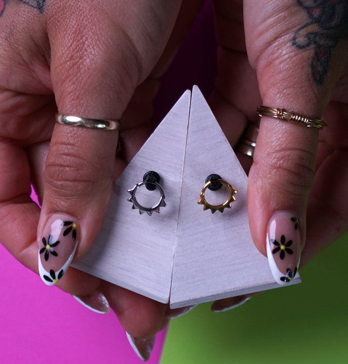 Another type of jewelry specific to those with stretched or gauged ears. This jewelry slides through the gauged lobe to weigh it down, leaving a space between the top of your gauge and the jewelry itself. Choosing ear weights over tunnels or plugs is purely based on personal style preferences. They are NOT to be used as a stretching tool! Ear weights also aren’t meant to be worn permanently and are often made of brass or silver—two materials that aren’t suitable for new piercings or extended wear.