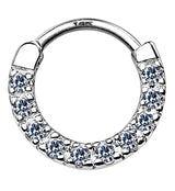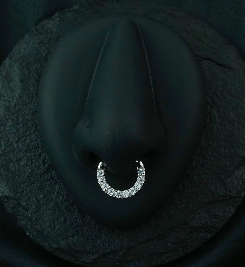 Dress up your septum or cartilage piercing with our 14kt White Gold Demi Hinged Segment Ring. Featuring a hinge that easily opens and clicks closed, this solid gold piece is adorned with sparkling cubic zirconia gems and comes in size 16G with a 3/8" (10mm) inner diameter. Sold individually.
