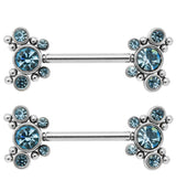 Unique nipple ring barbells with a threadless design. Made from 316L stainless steel and beautiful aqua cz gems within a beaded design. The threadless design makes for easy insertion and removal. Size is 14G with an inner barbell length of 9/16" (14mm). Sold in pairs (2pcs). For healed piercings.
