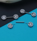 Gorgeous threadless nipple ring barbells made from 316L stainless steel. On each end there is a flower design filled with clear cz gems. The threadless design makes for easy insertion and removal. Size is 14G with an inner barbell length of 9/16" (14mm). Sold in pairs (2pcs). For healed piercings.