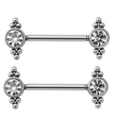 Classic nipple ring barbells with a threadless design. Made from 316L stainless steel and a sparkling cz gem on either side, decorated with clusters of beads. The threadless design makes for easy insertion and removal. Size is 14G with an inner barbell length of 9/16" (14mm). Sold in pairs (2pcs). For healed piercings.