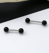 Sleek black agate stone barbells. Size is 14G with a length of either 1/2" (12mm) or 5/8" (16mm). 6mm stone balls on each end. Made from 316L stainless steel. Externally threaded. Sold individually (1 pc). For healed piercings.