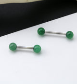 Pretty aventurine green stone barbells. Size is 14G with a length of either 1/2" (12mm) or 5/8" (16mm). 6mm stone balls on each end. Made from 316L stainless steel. Externally threaded. Sold individually (1 pc). For healed piercings.