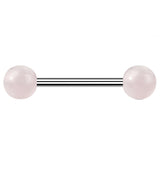 Natural rose quartz stone barbells. Size is 14G with a length of either 1/2" (12mm) or 5/8" (16mm). 6mm stone balls on each end. Made from 316L stainless steel. Externally threaded. Sold individually (1 pc). For healed piercings.