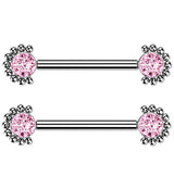 Indulge yourself with our beaded titanium nipple rings! Featuring a straight 14g barbell with 9/16” wearable area and a 4mm pink CZ gem on each end. Constructed with hypoallergenic ASTM F-136 titanium and internally threaded for a secure fit. Sold as a pair.